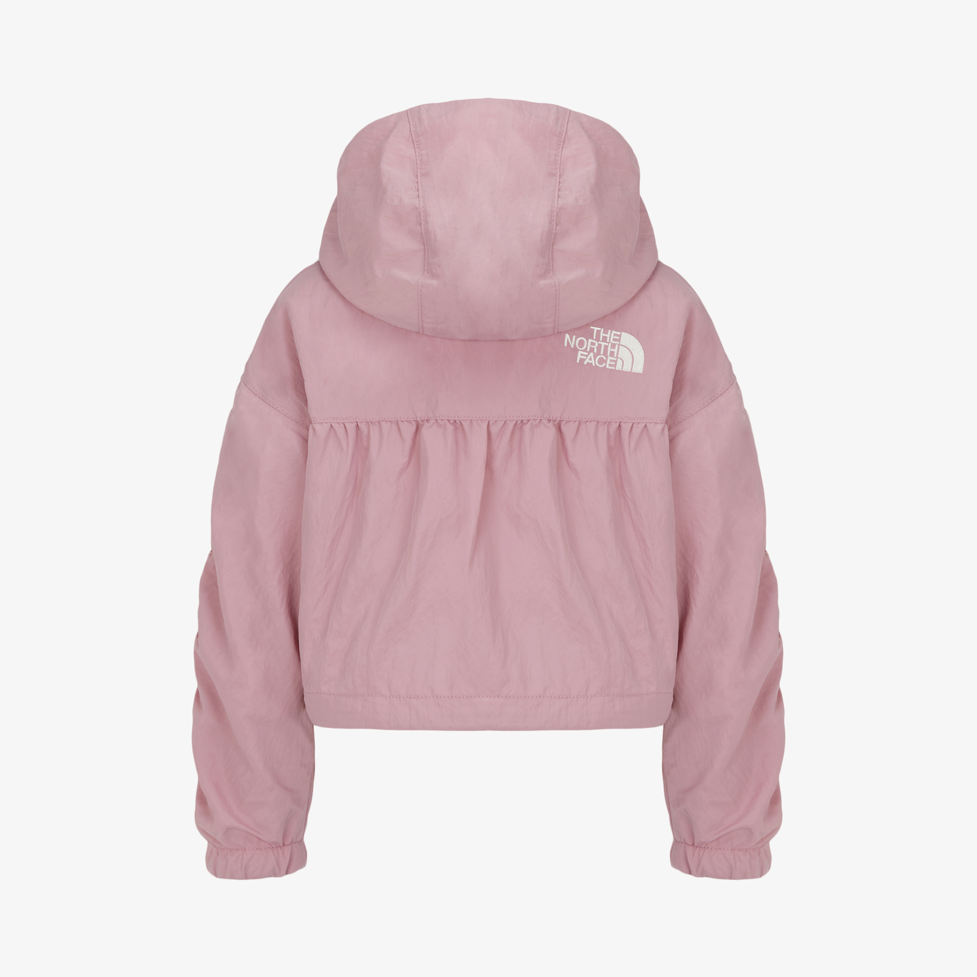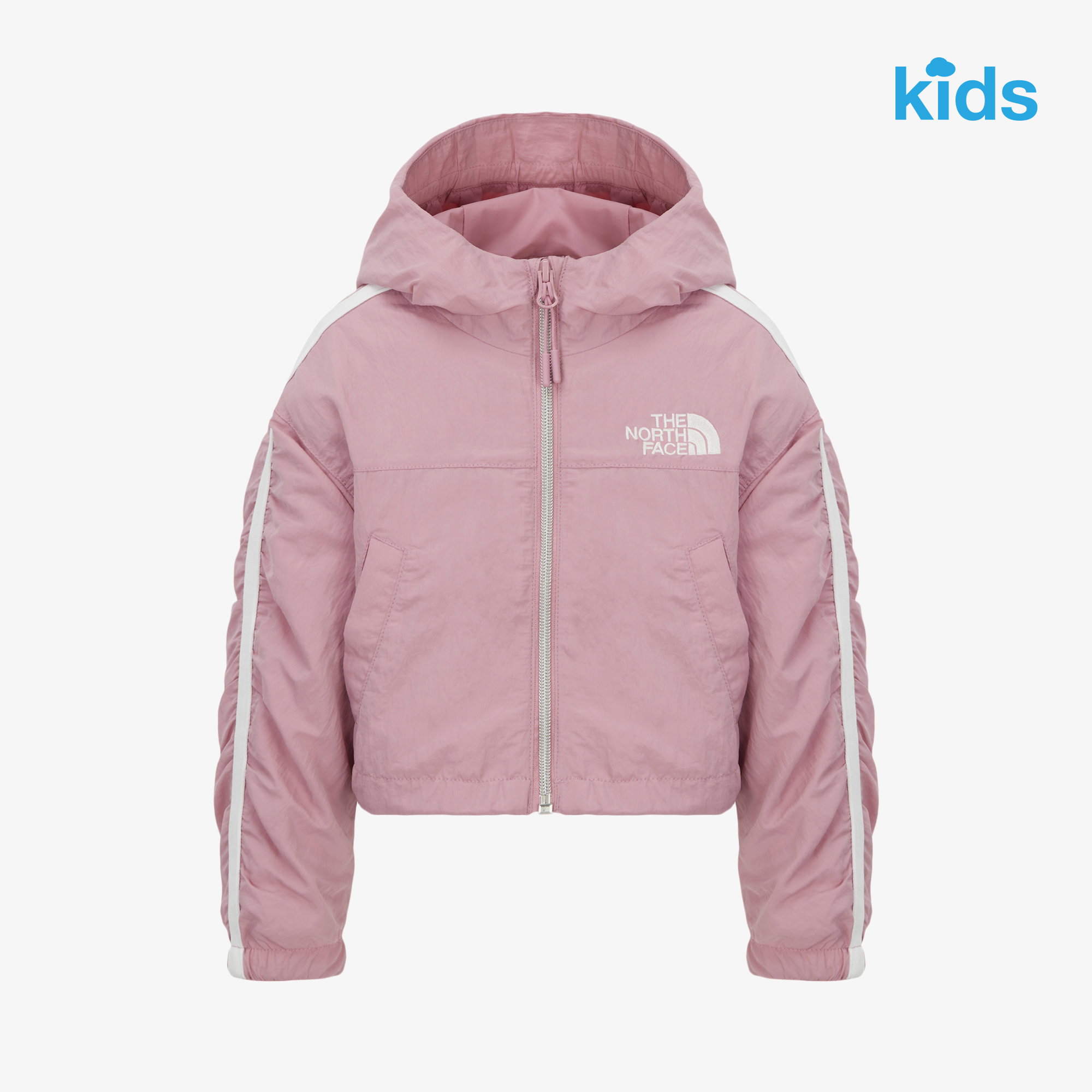 광택감 있는 소재와 어깨부터 소매까지 이어지는 테이핑, 셔링 디테일이 돋보이는 여아용 자켓입니다.
