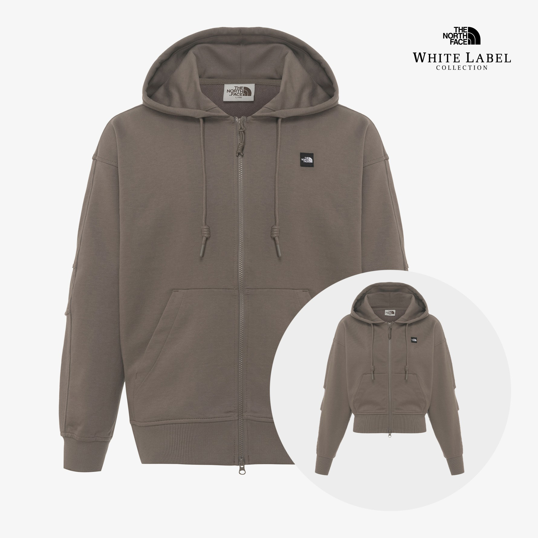 후드 집업 자켓 스타일로 남자 전용 사이즈는 루즈핏으로, 여자 전용 사이즈는 세미 크롭 기장으로 나온 제품입니다.