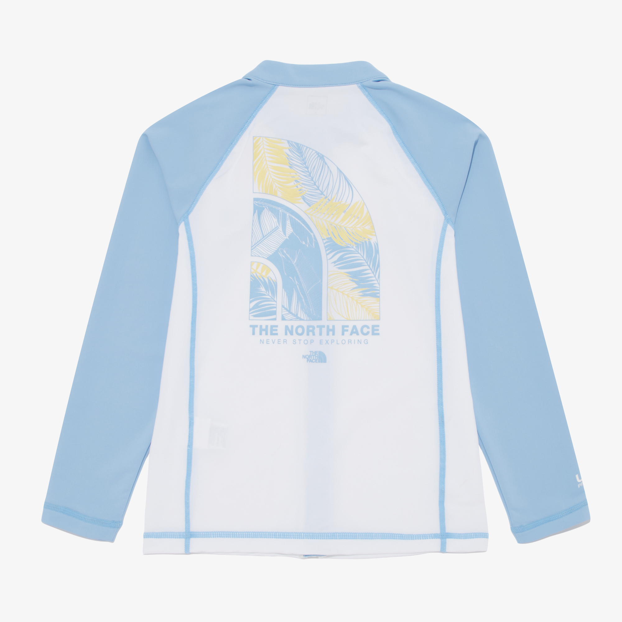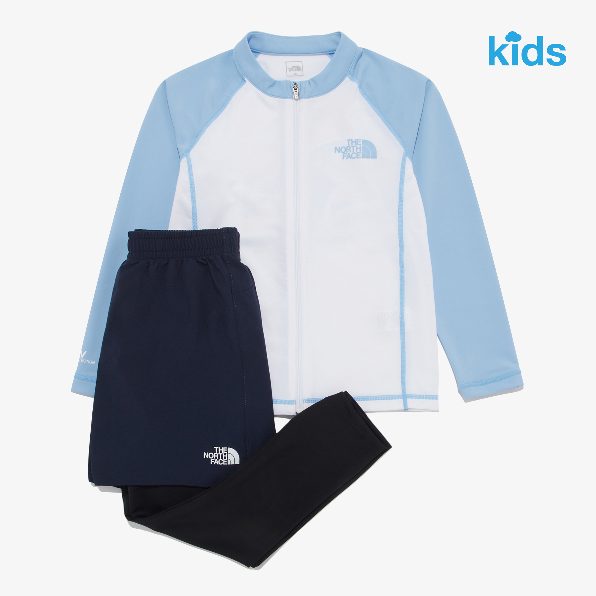 뒷판에 그래픽으로 포인트 준 스텐넥 레쉬가드 ZIP UP과 레깅스가 부착된 워터 숏 팬츠가 세트로 구성된 제품입니다.