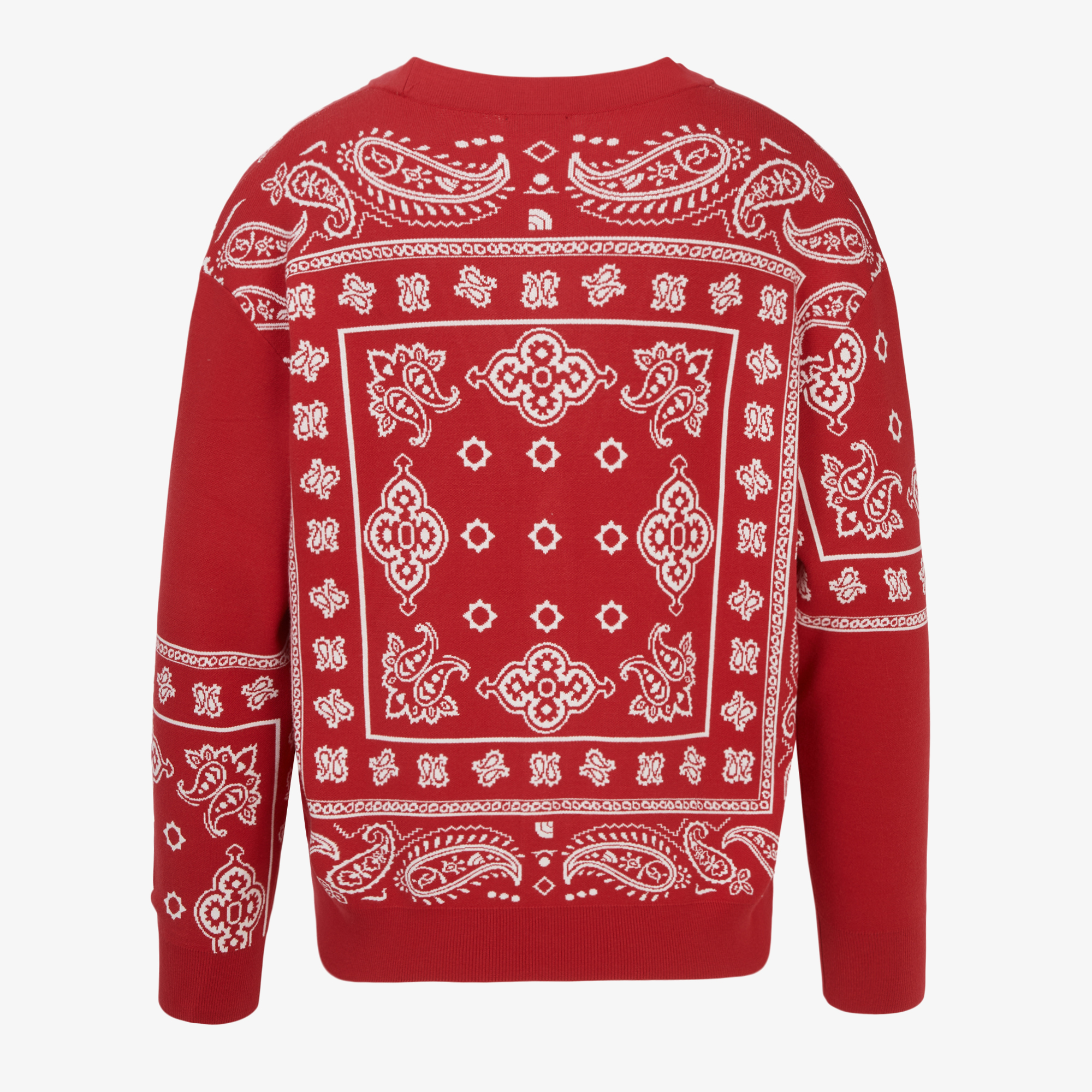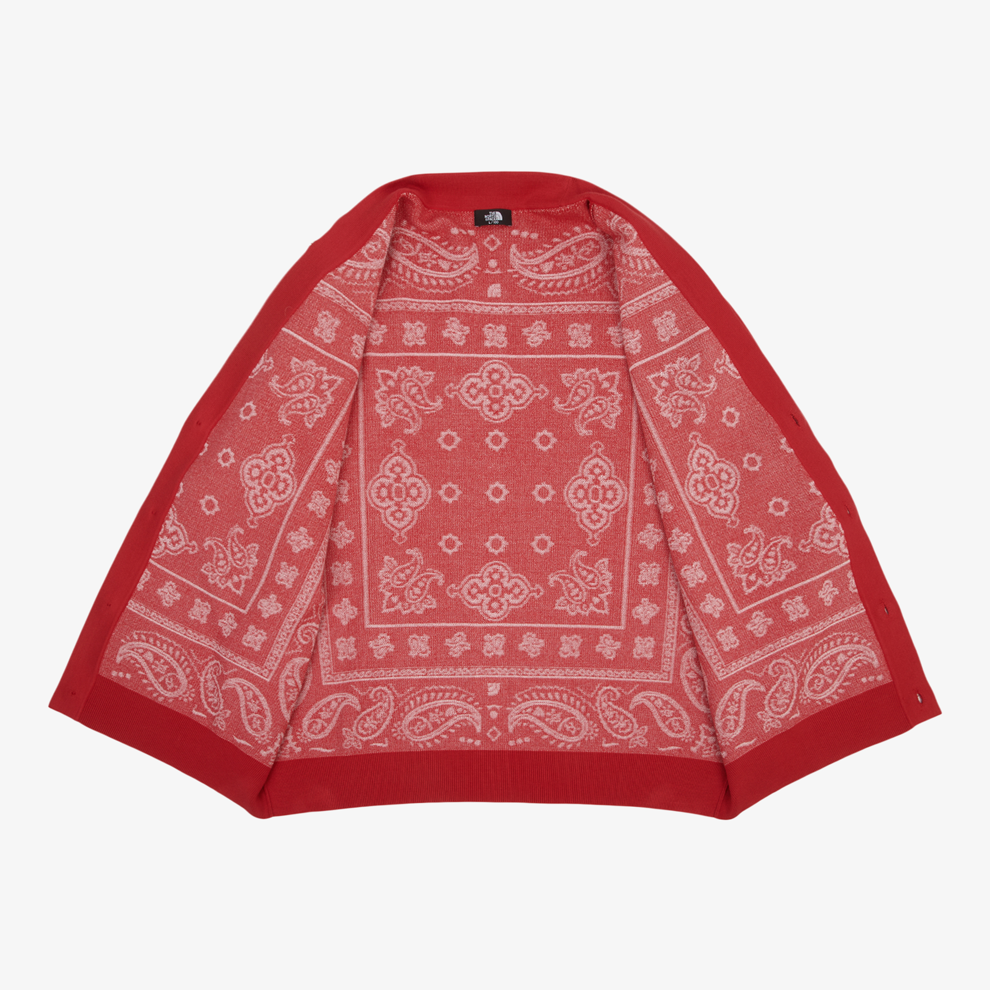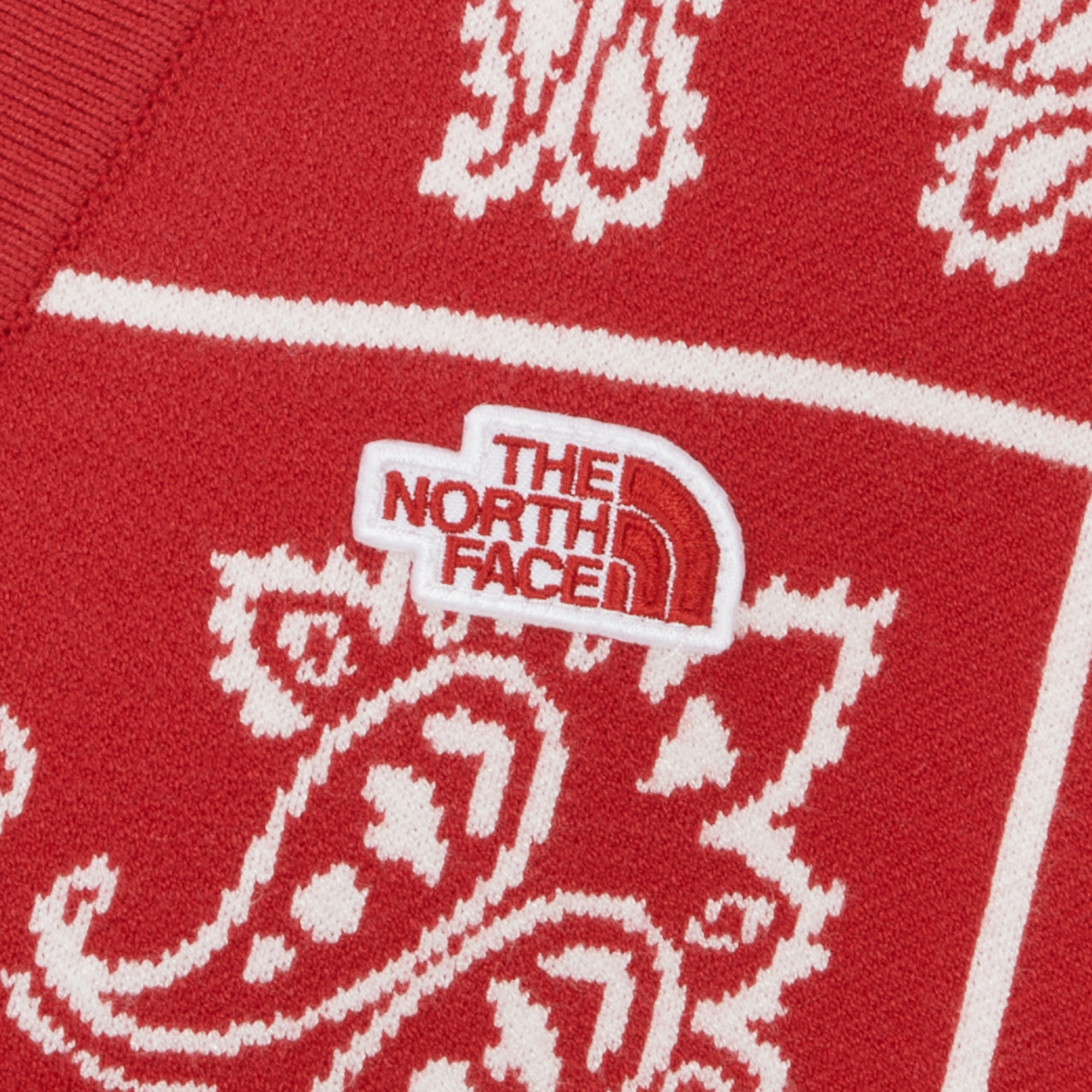 페이즐리 패턴 사이에 하프돔 로고를 함께 편직하여 노스페이스만의 패턴을 만들었습니다.