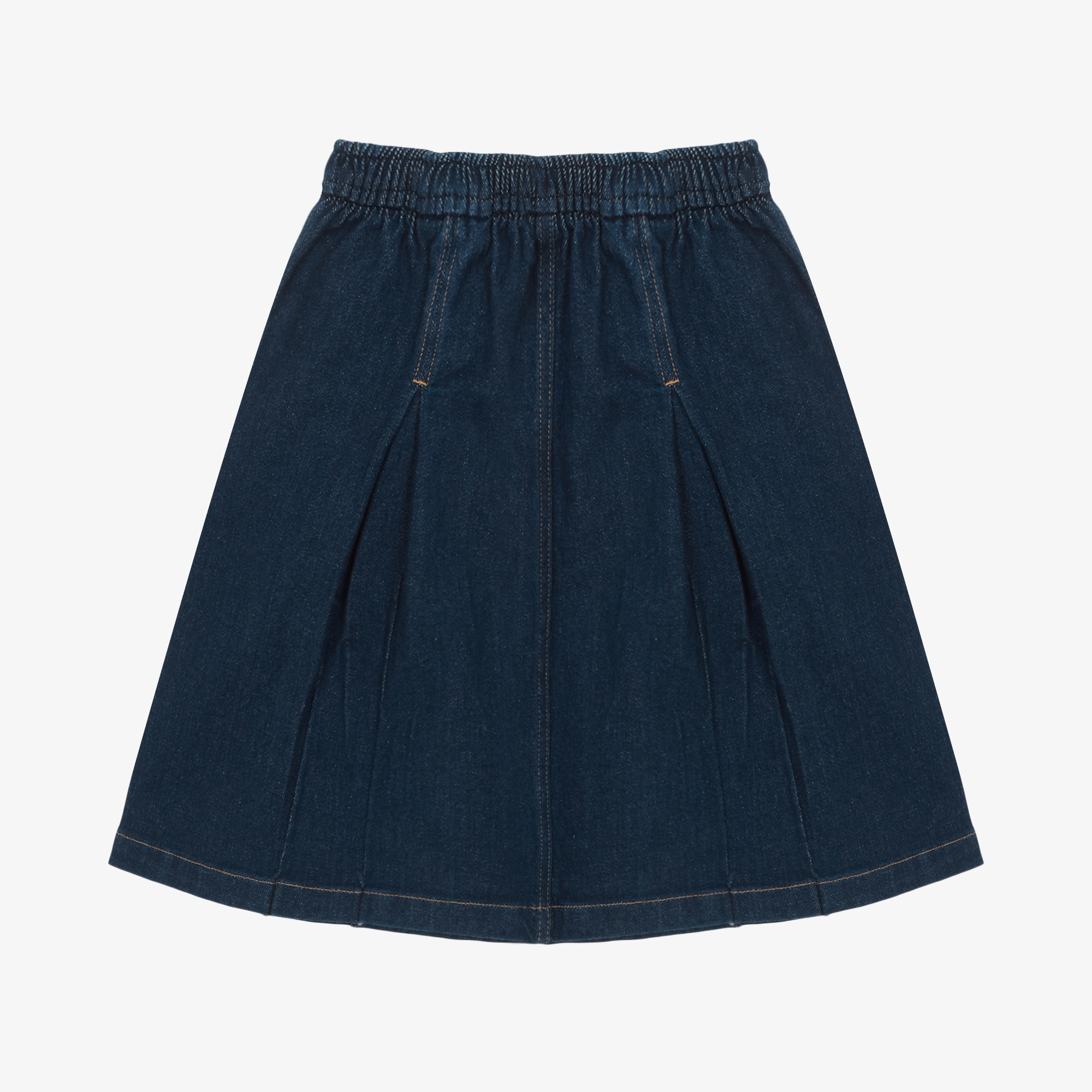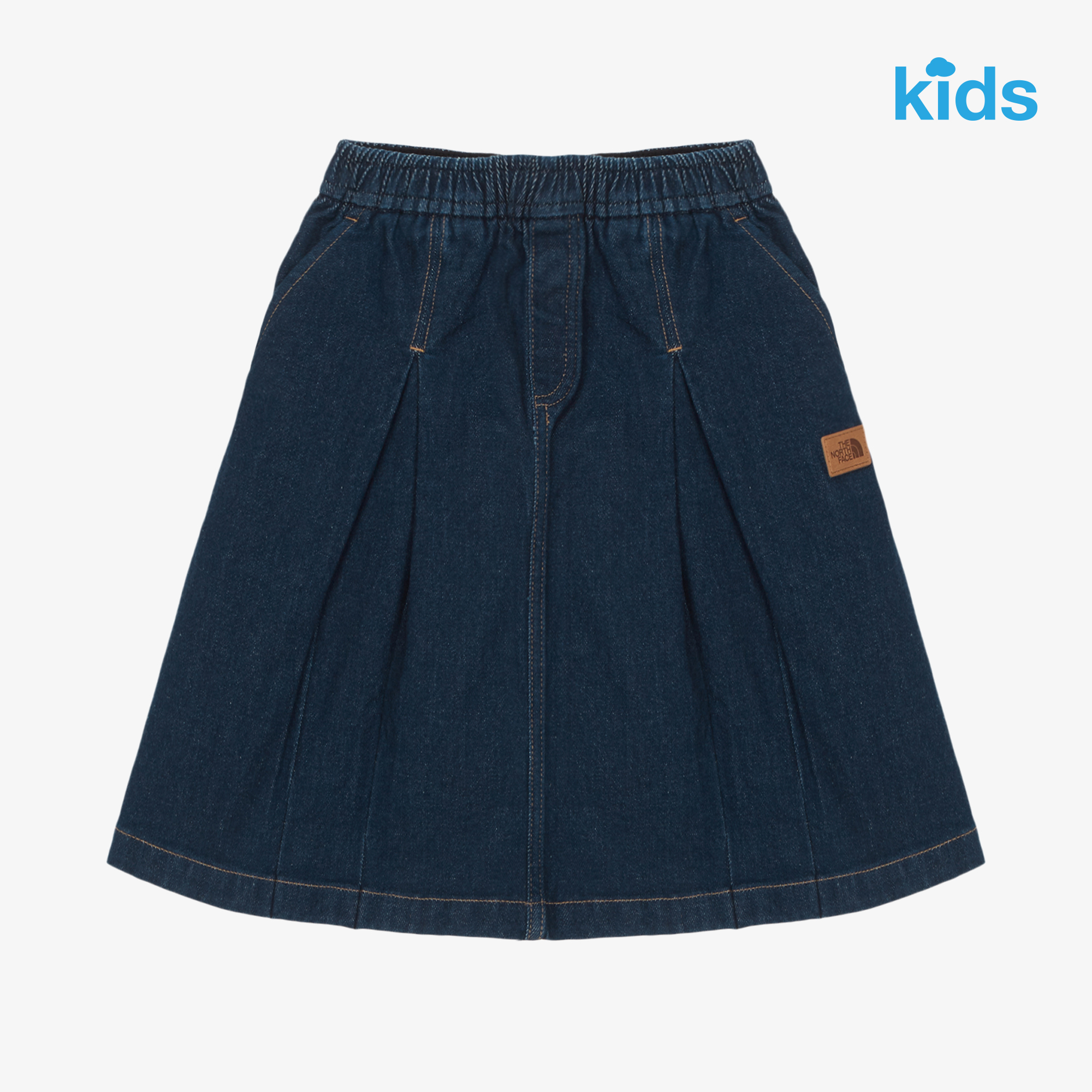 데님 소재로 진행된 미디 기장의 A라인 플리츠 스커트 입니다.