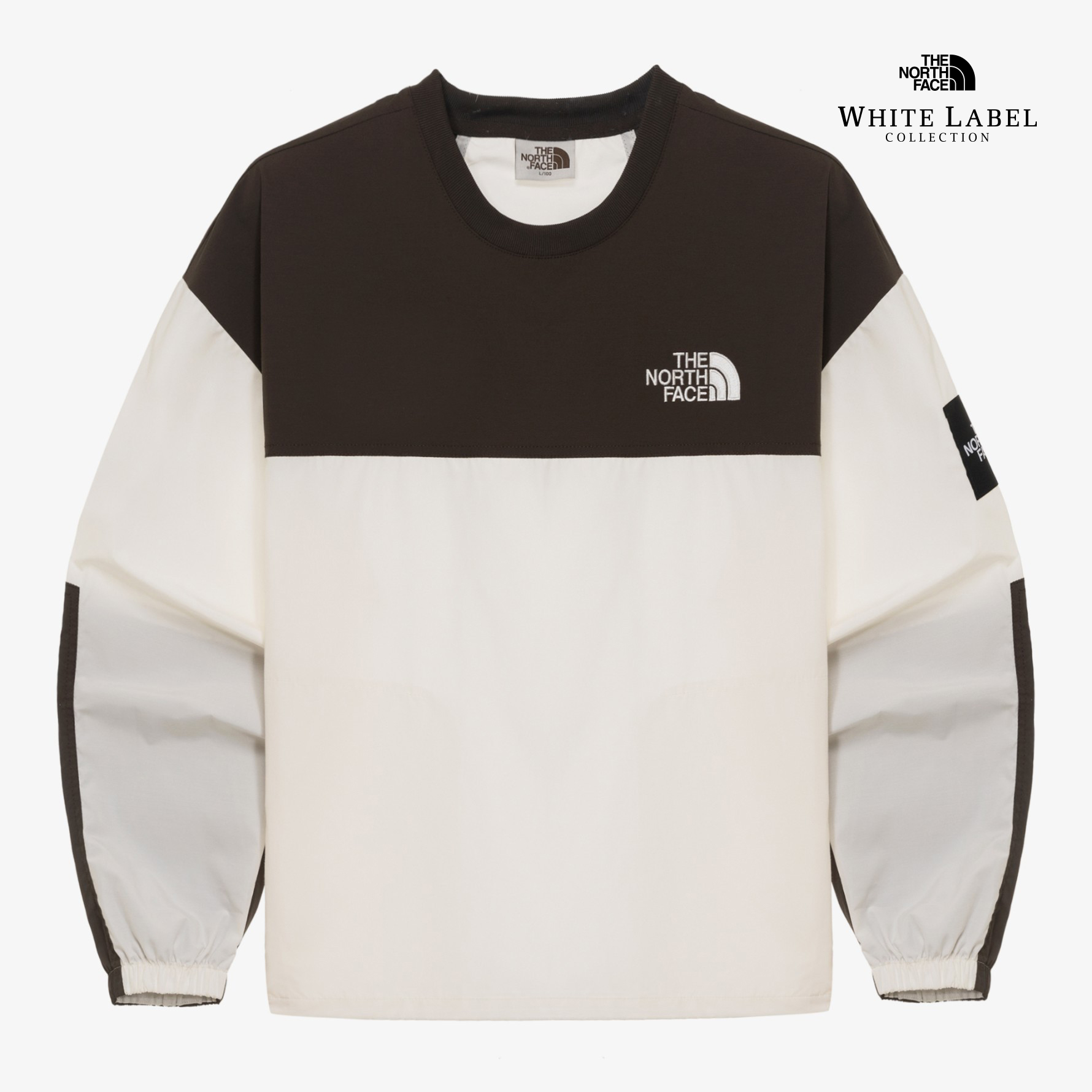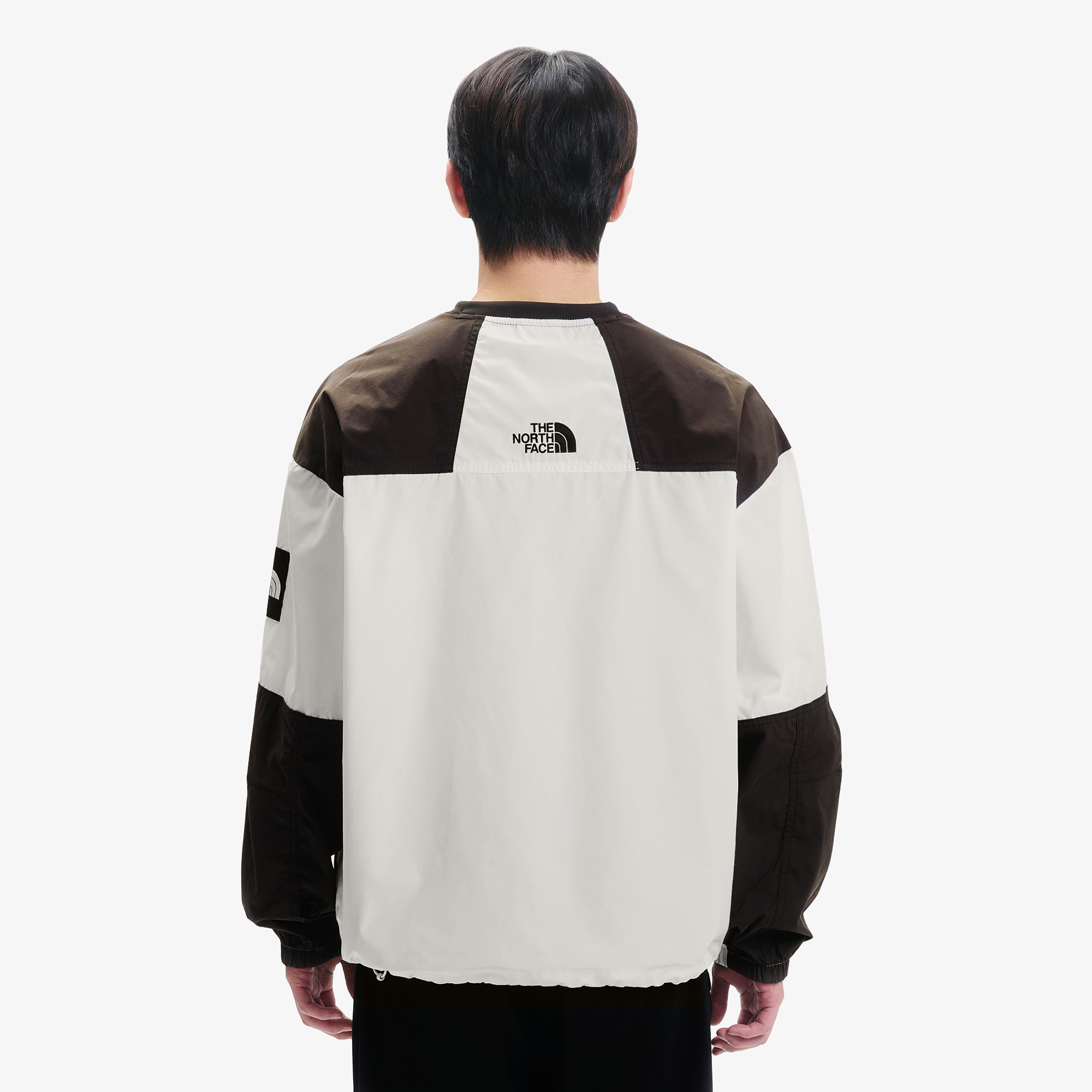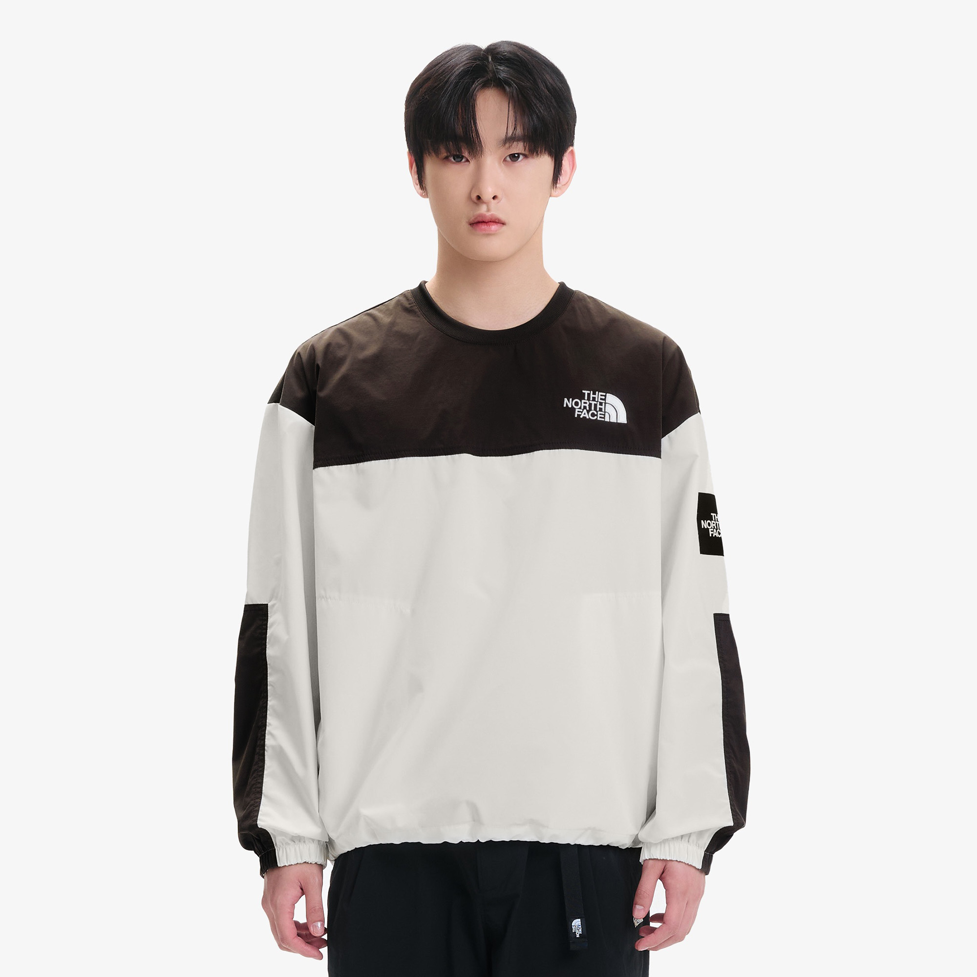 우븐 원단을 사용한 루즈핏의 라운드 긴팔 맨투맨 제품입니다.
