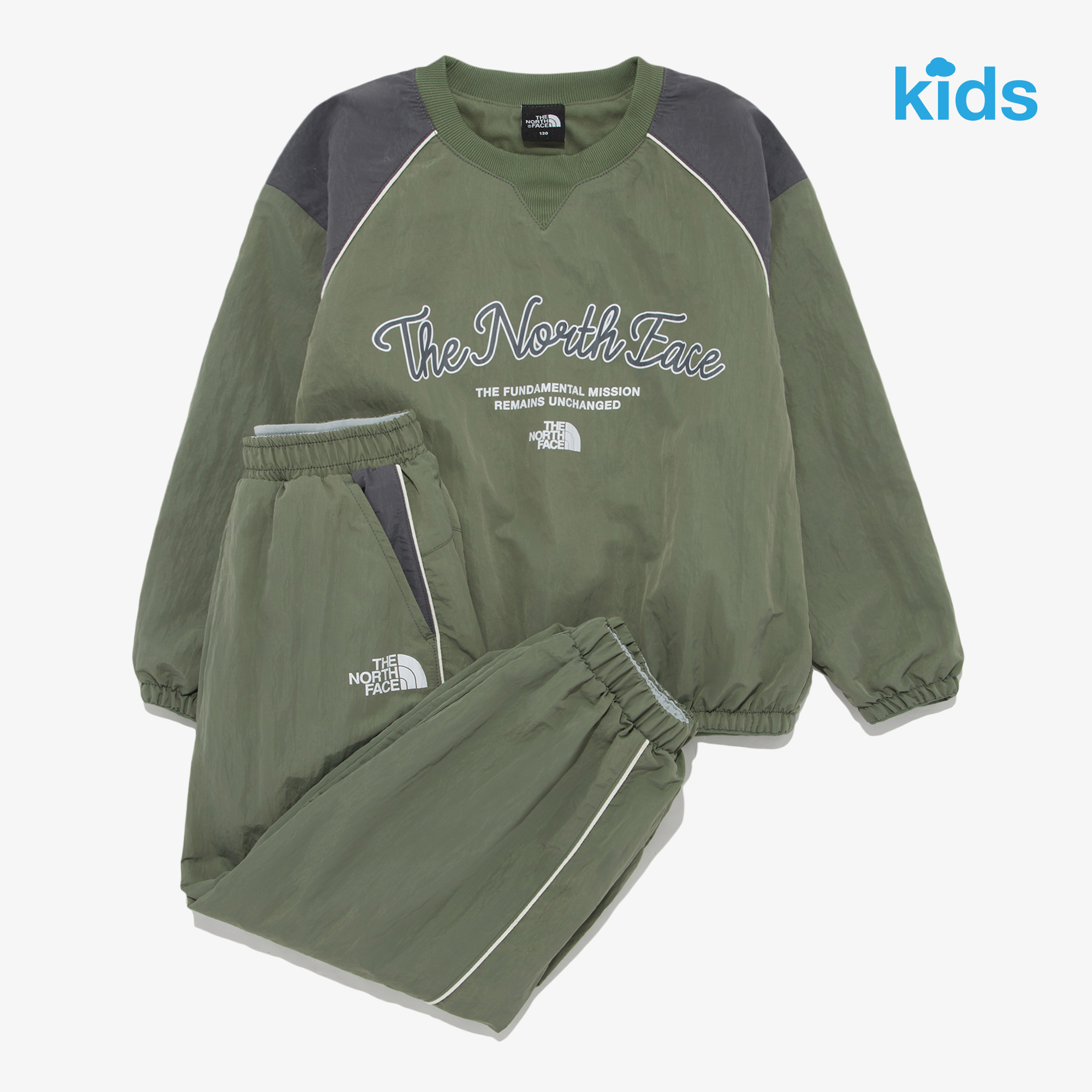 스포티한 무드의 상하의 우븐 셋업으로, 컬러블럭과 가슴 레터링 그래픽이 포인트인 제품입니다.
