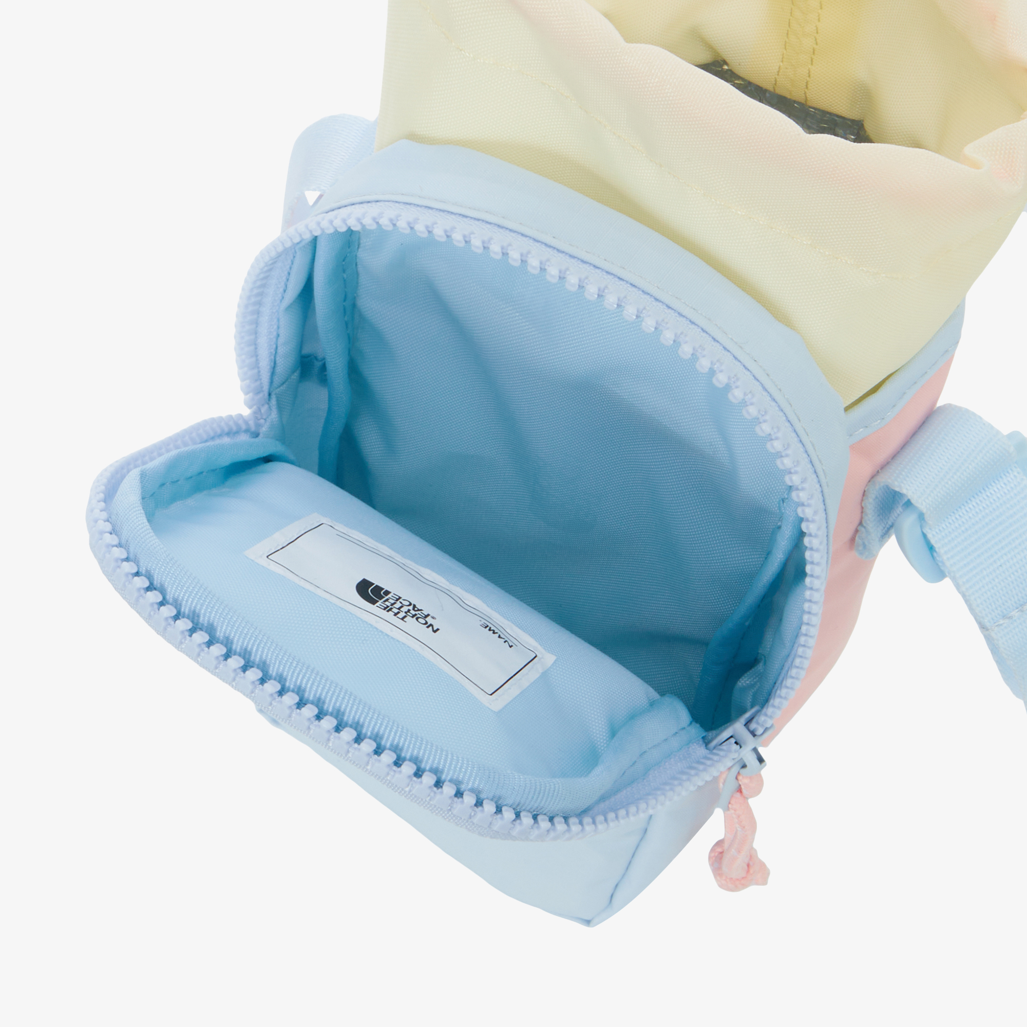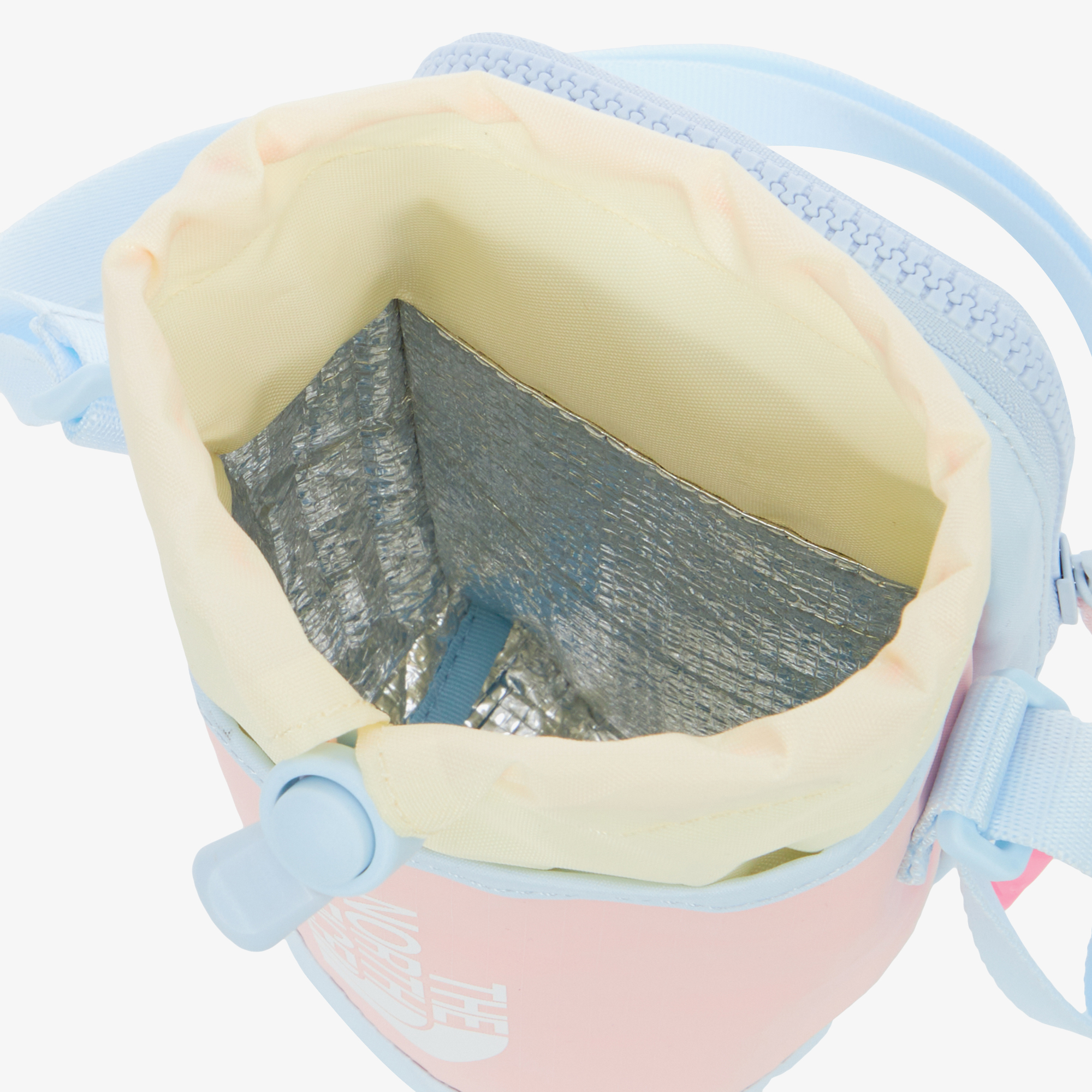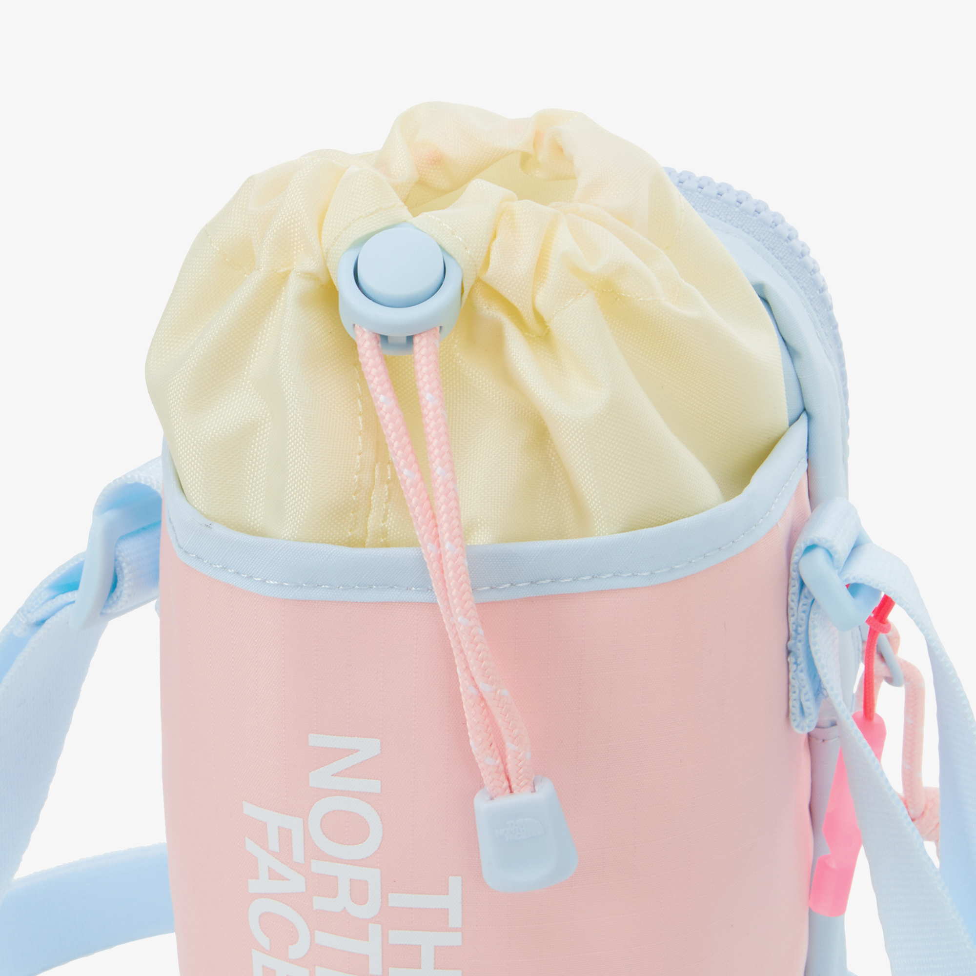 물통가방 입구의 스트링을 조여서 내용물이 빠져나오지 않게 여밀 수 있습니다.