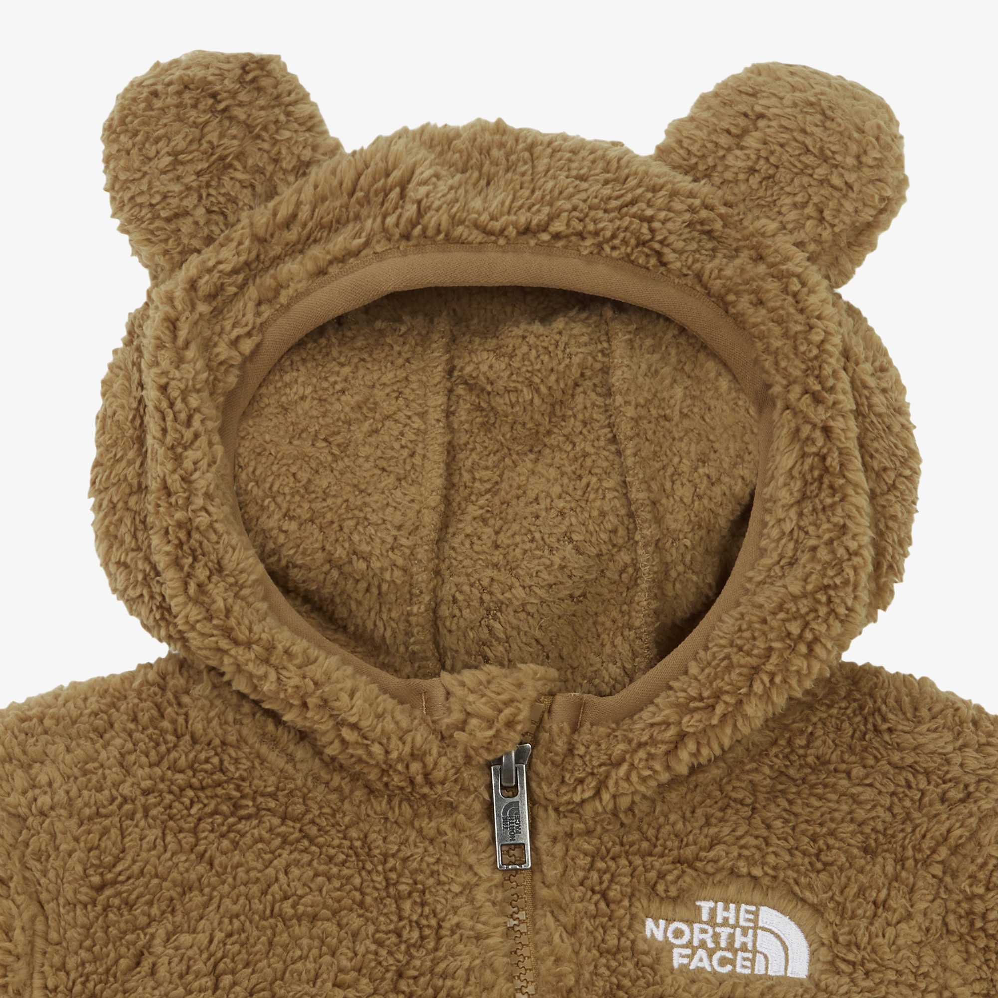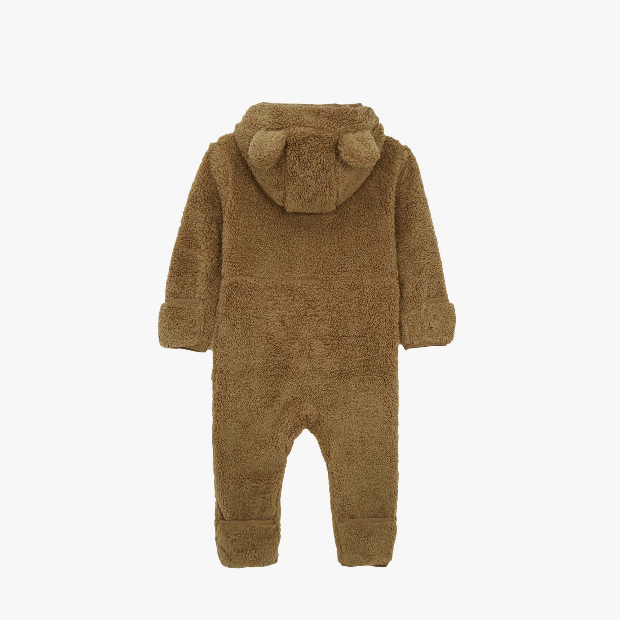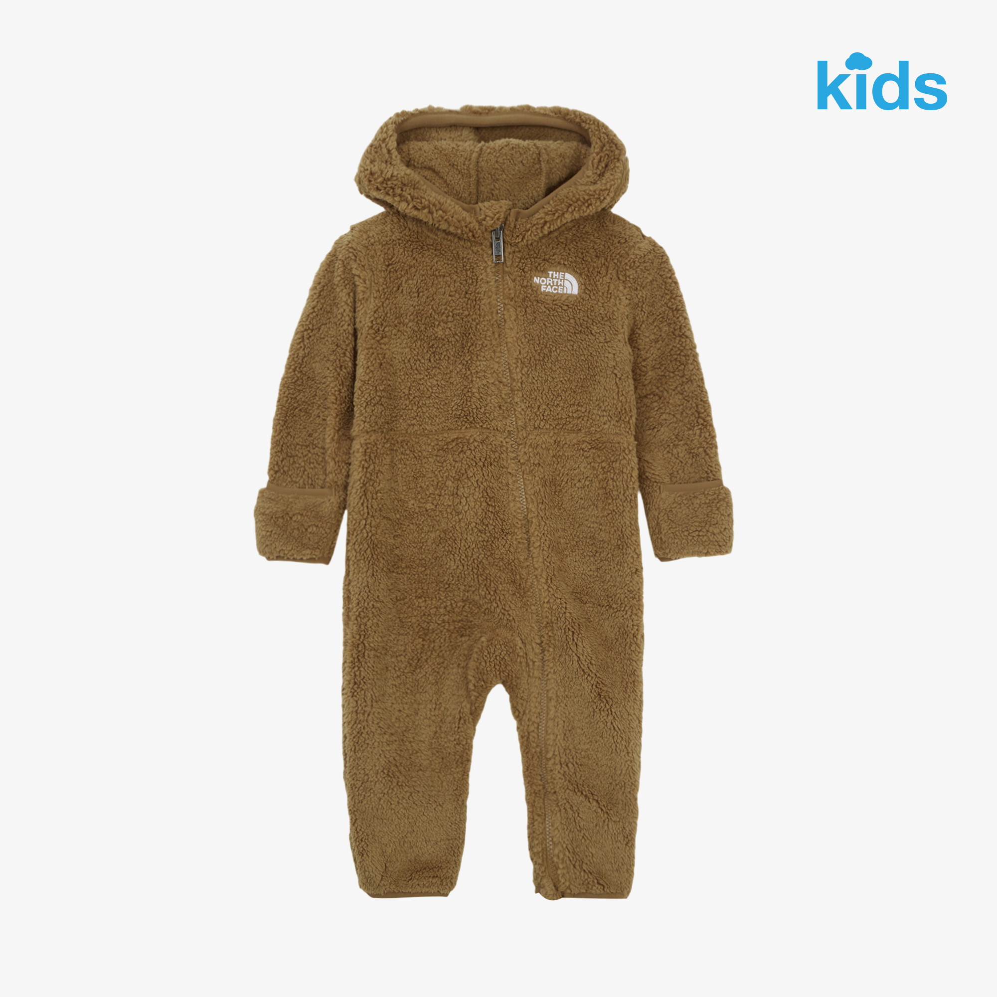 부드럽고 따뜻한 리사이클 플리스 소재를 사용한 유아용 우주복입니다.