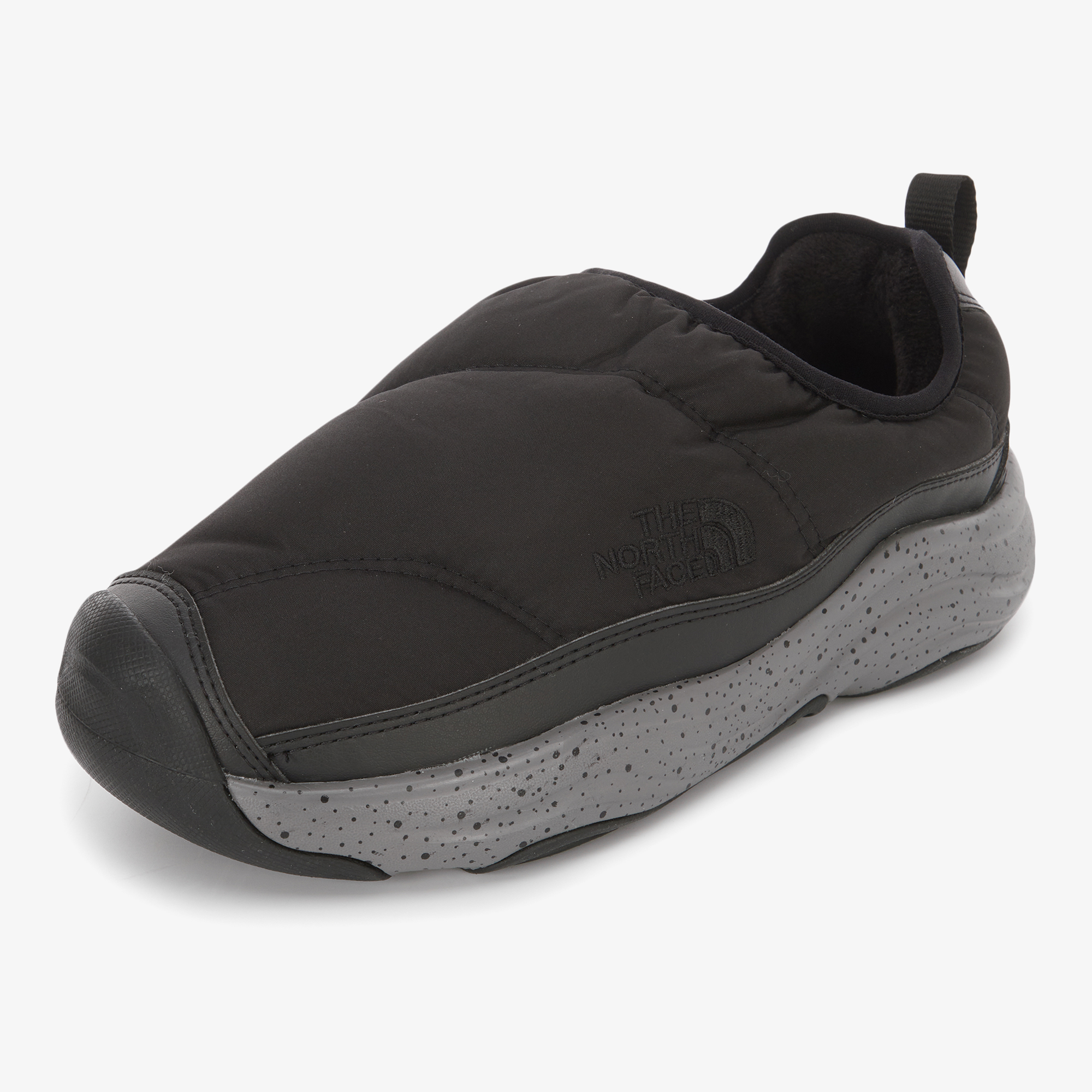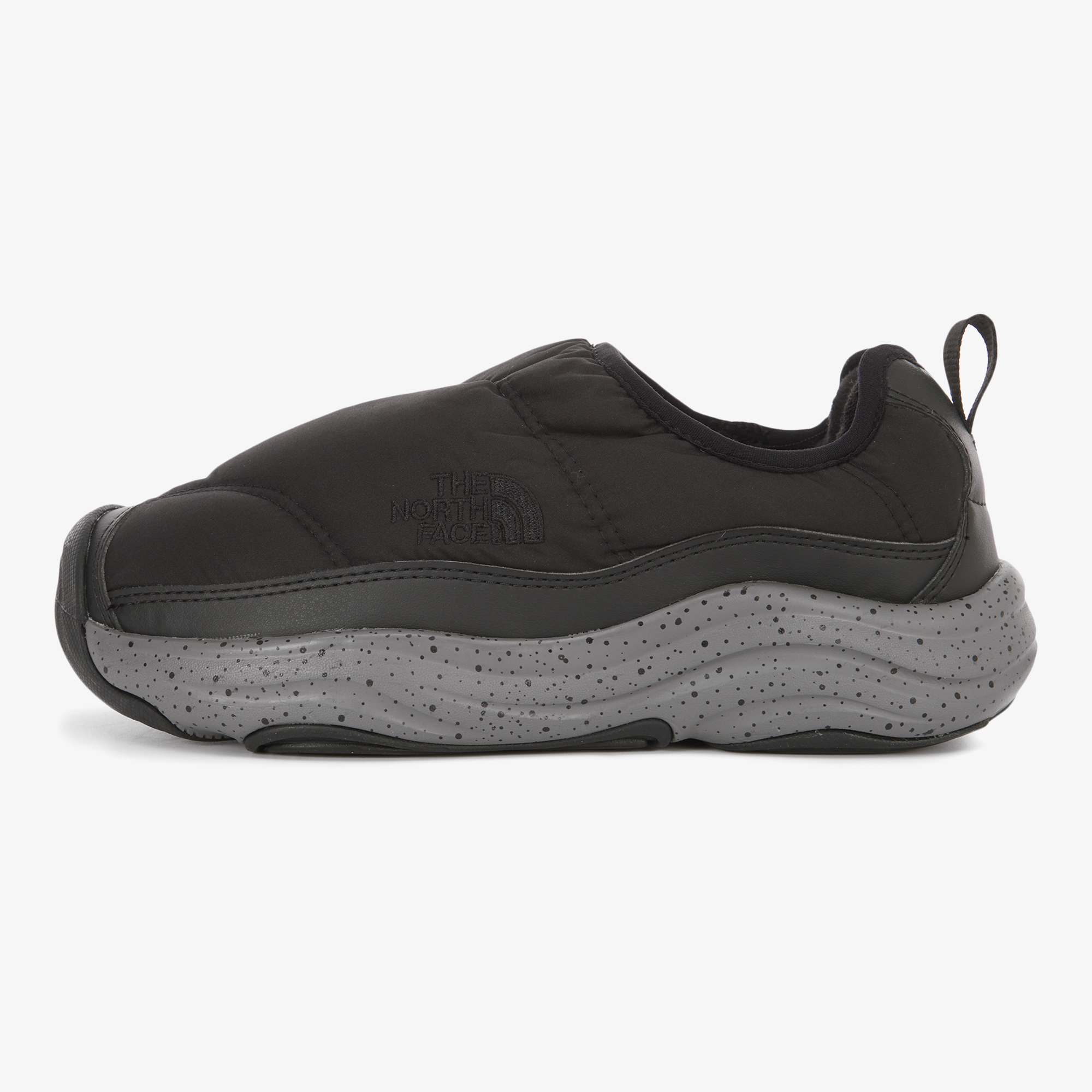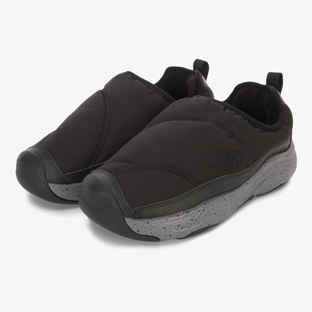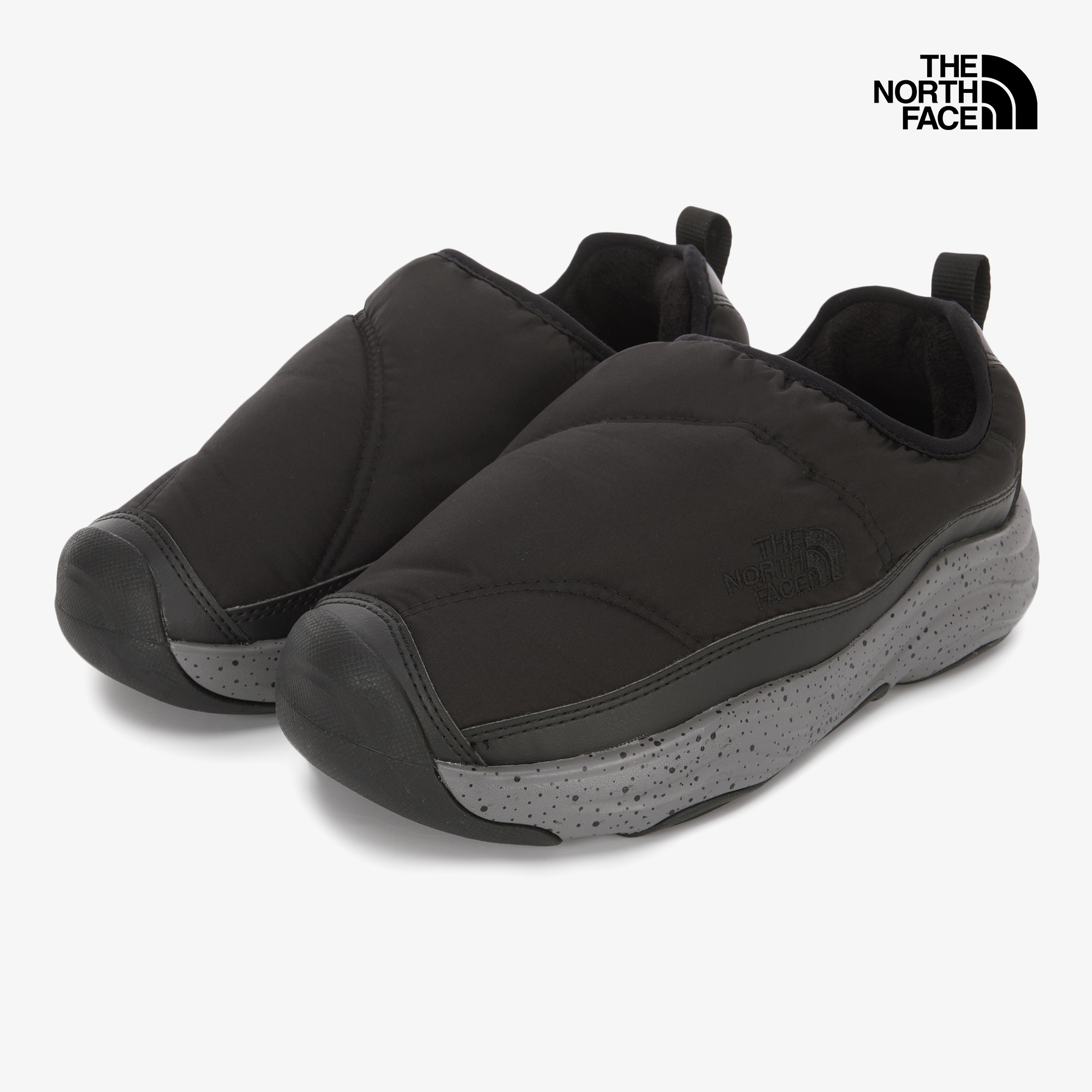 신발에 전체적으로 노스페이스의 하프돔로고 패턴을 적용한 Mule 스타일 방한화입니다.
