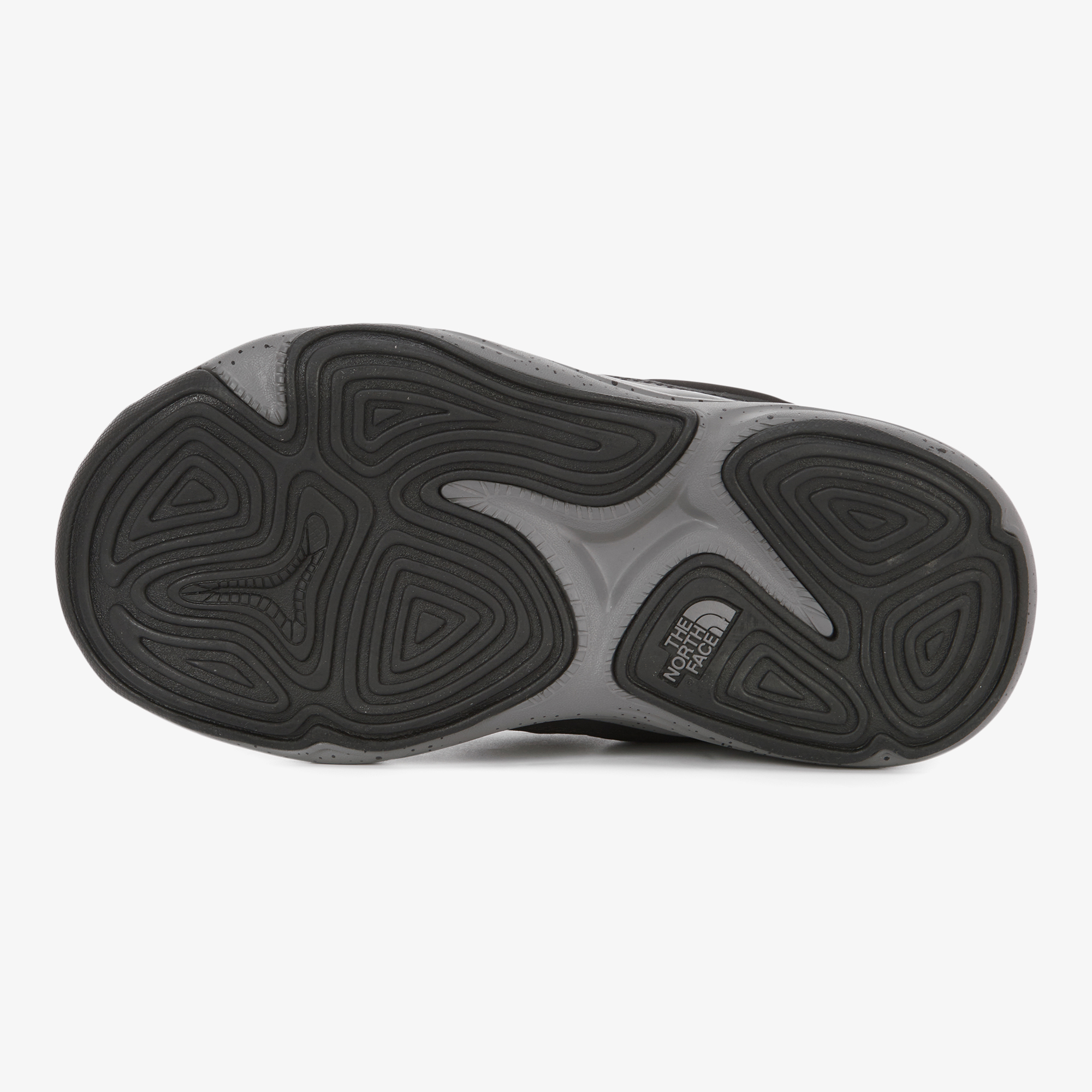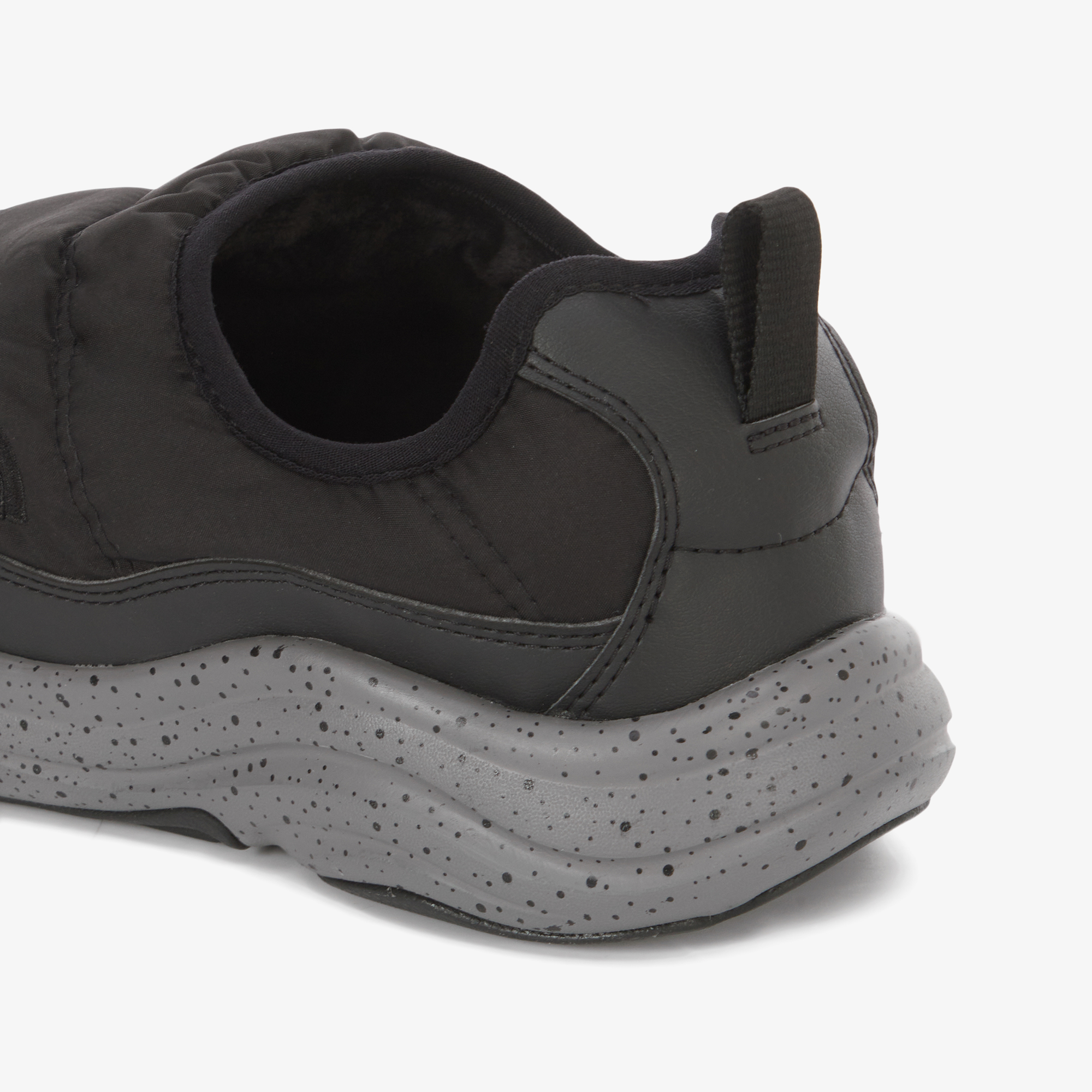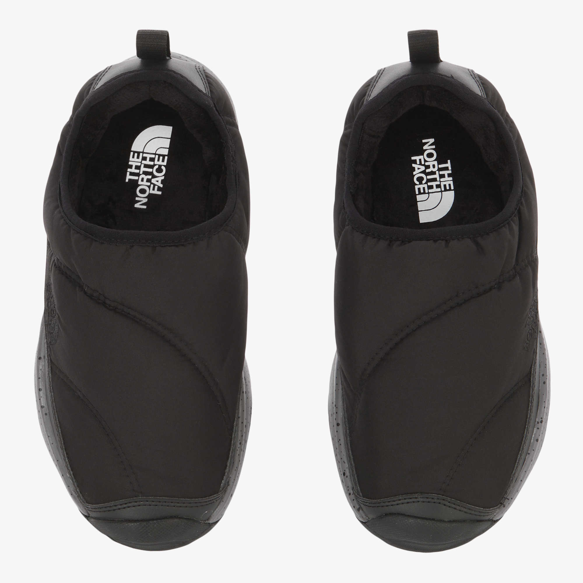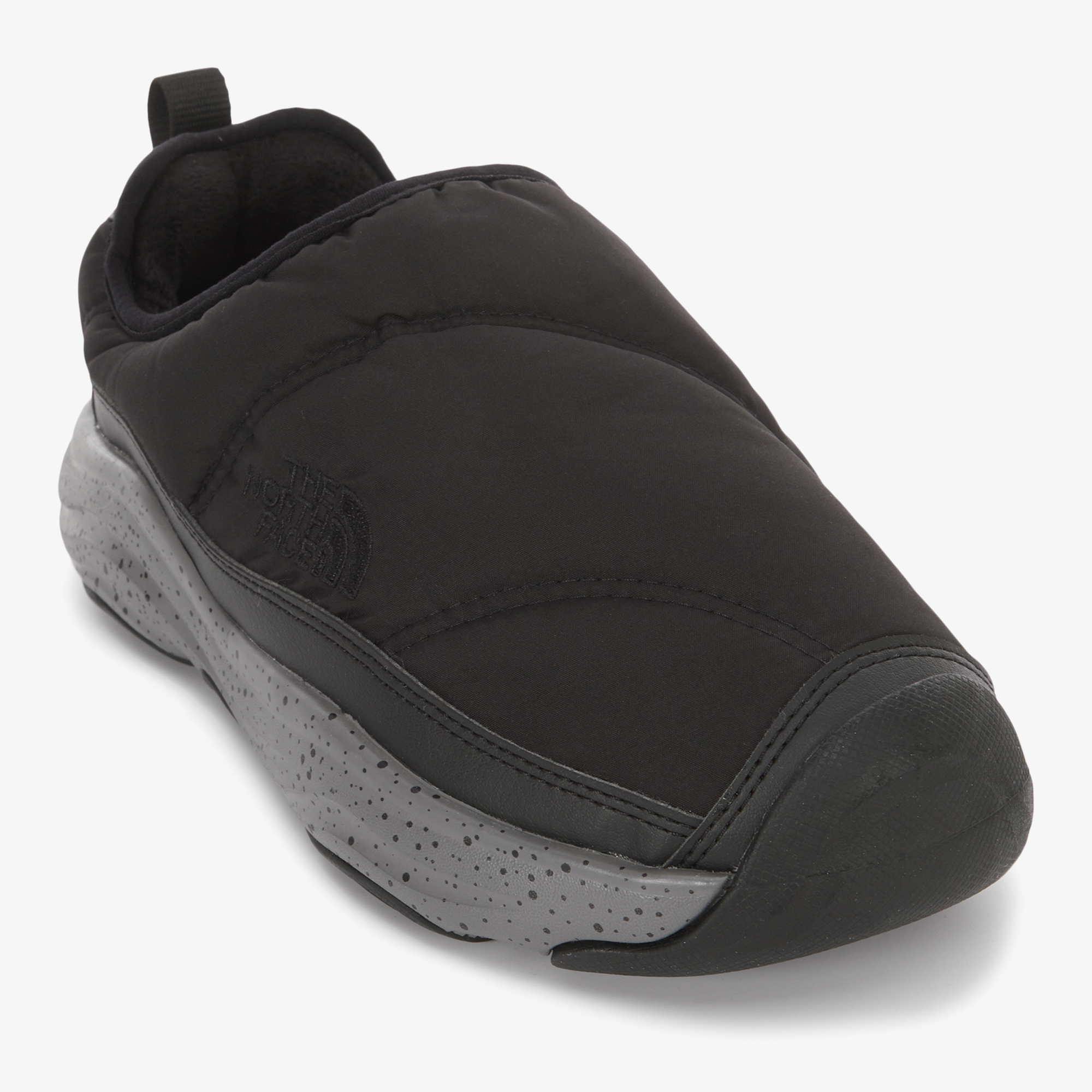 신발에 전체적으로 노스페이스의 하프돔로고 패턴을 적용한 Mule 스타일 방한화입니다.