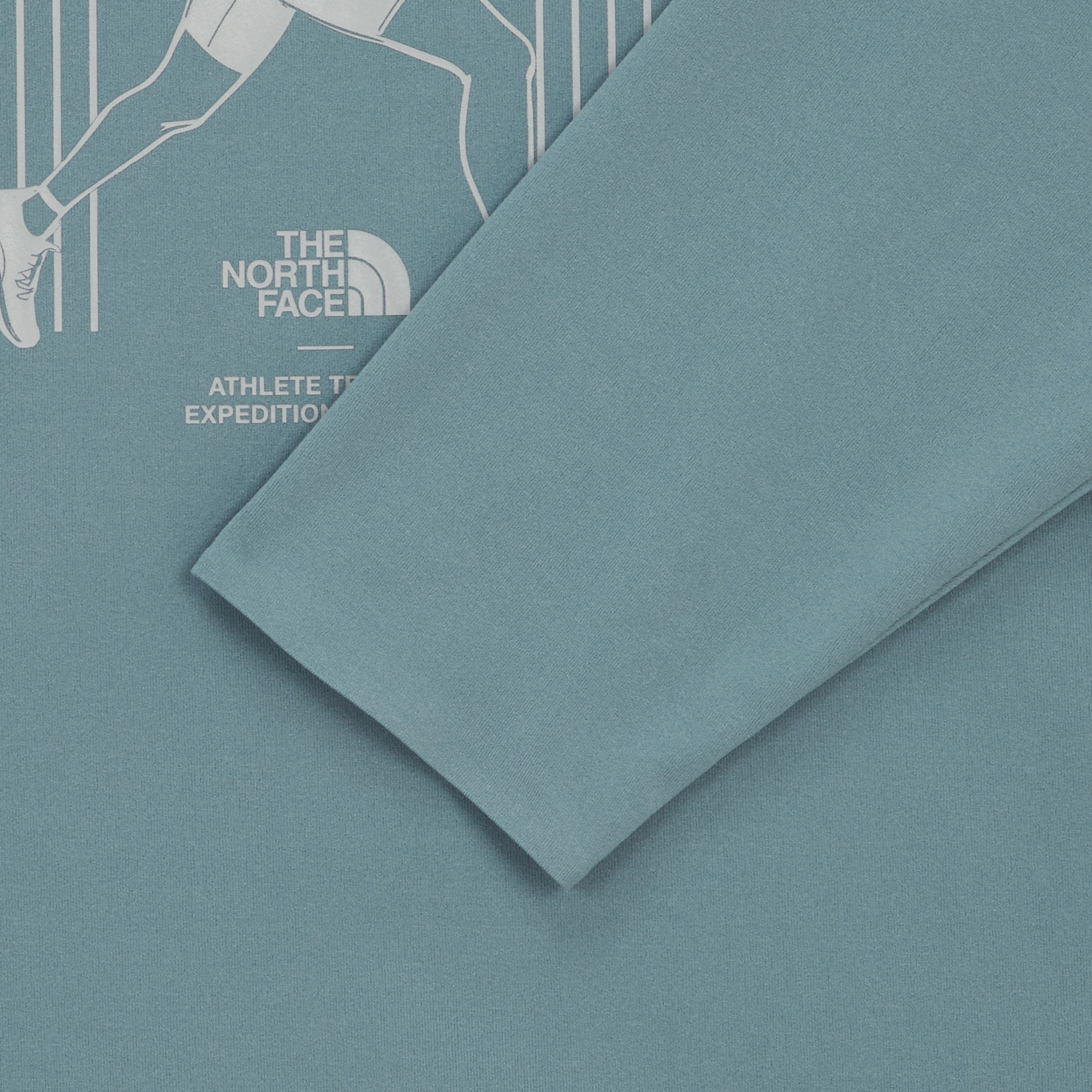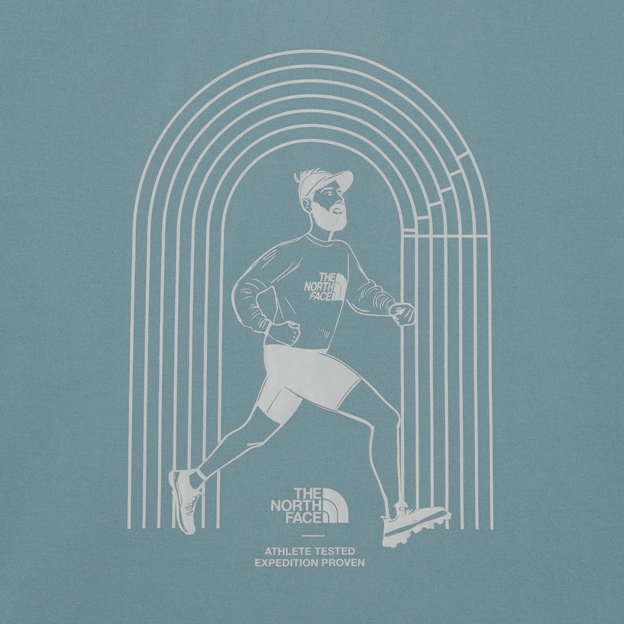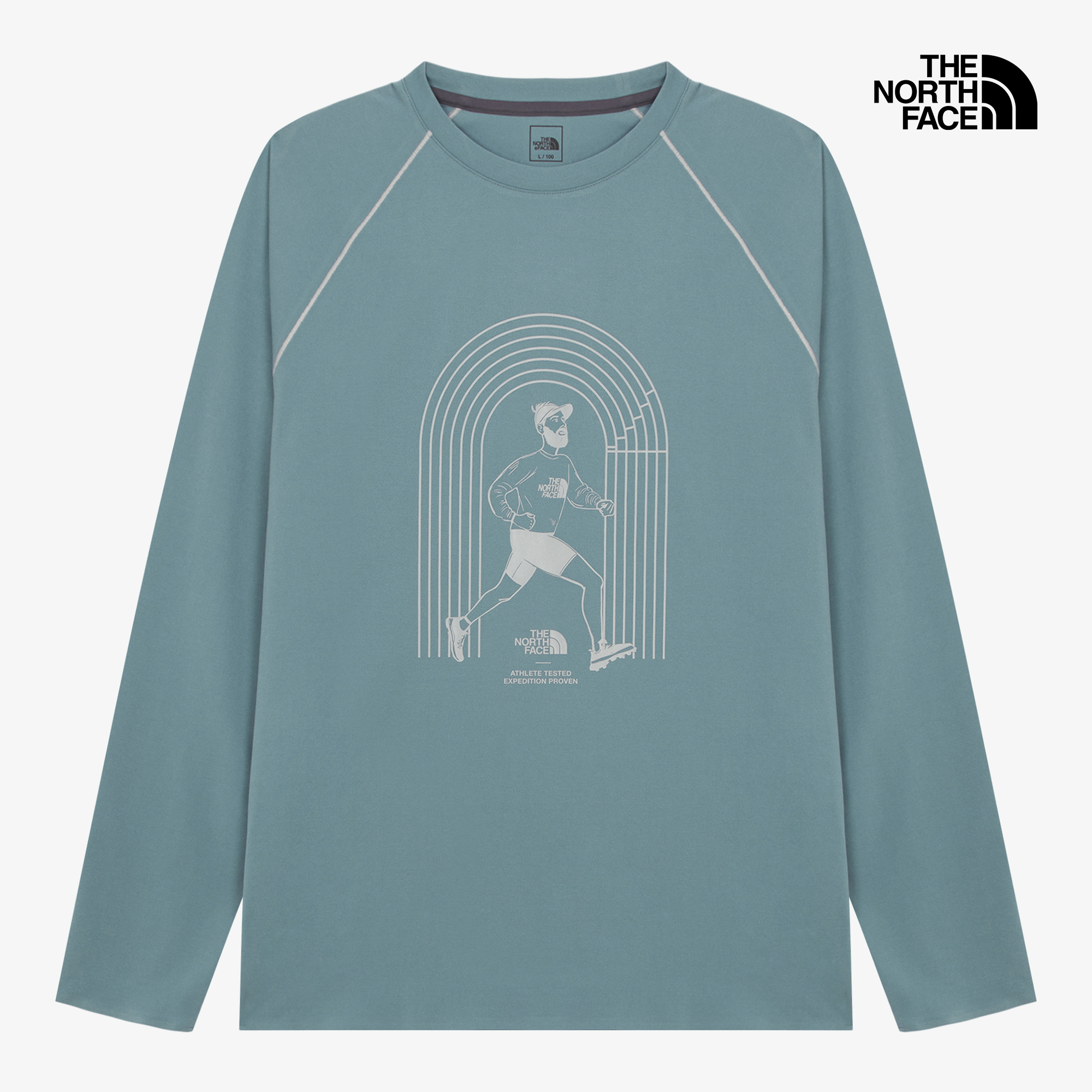 러너와 노스페이스의 돔 로고를 활용한 일러스트 그래픽이 돋보이는 러닝용 긴팔 티셔츠입니다.