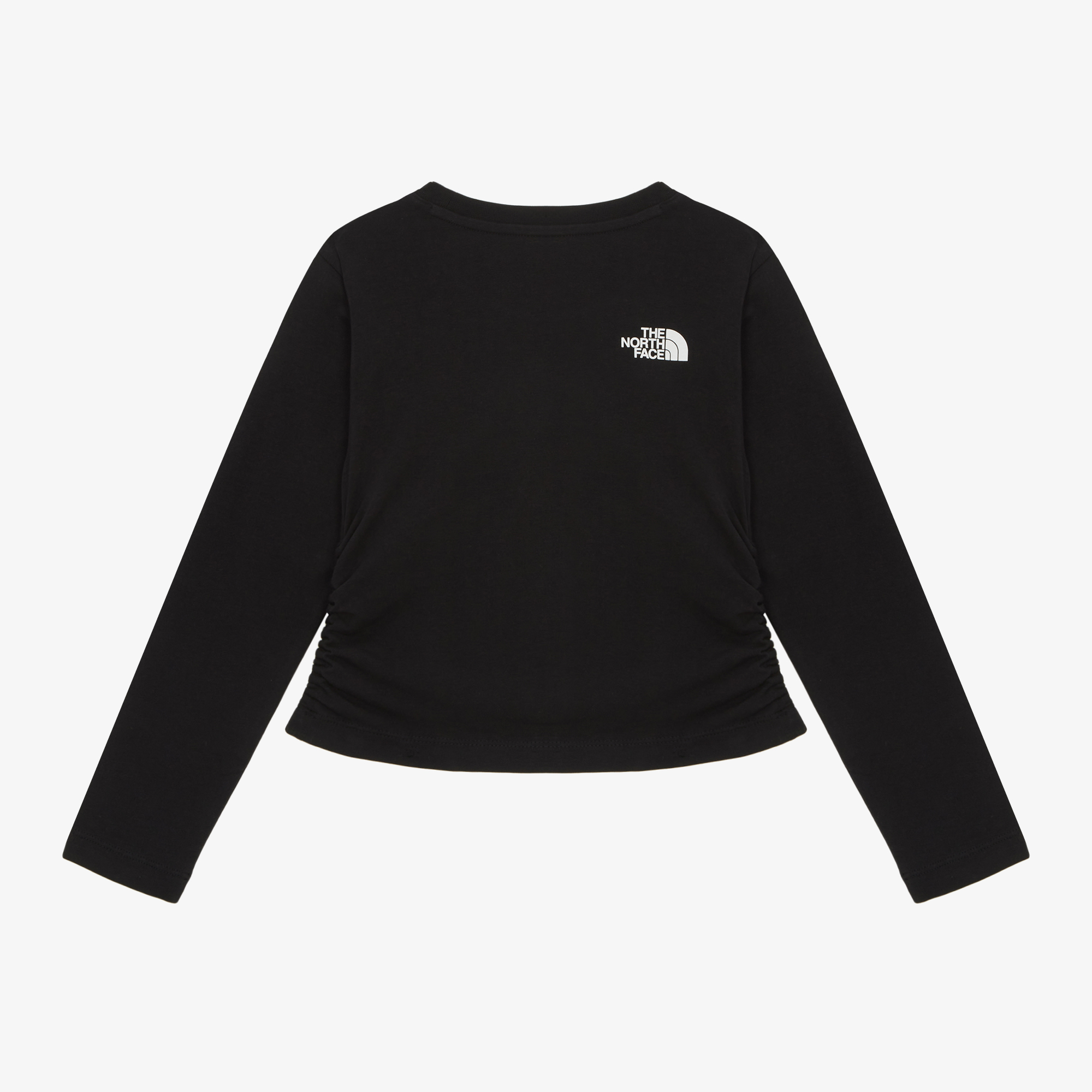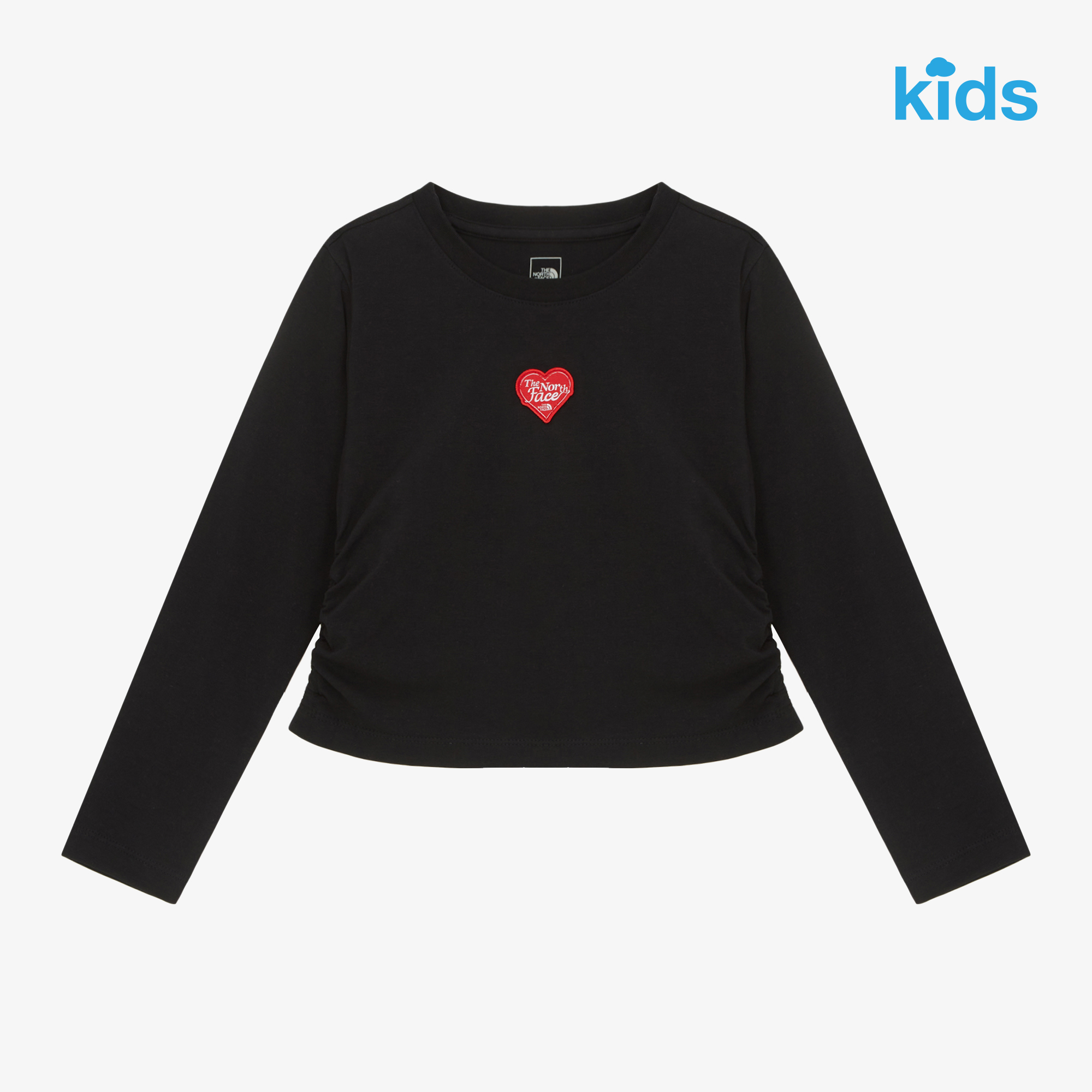 세미 크롭 기장의 여아 전용 라운드넥 롱슬리브 티셔츠입니다.