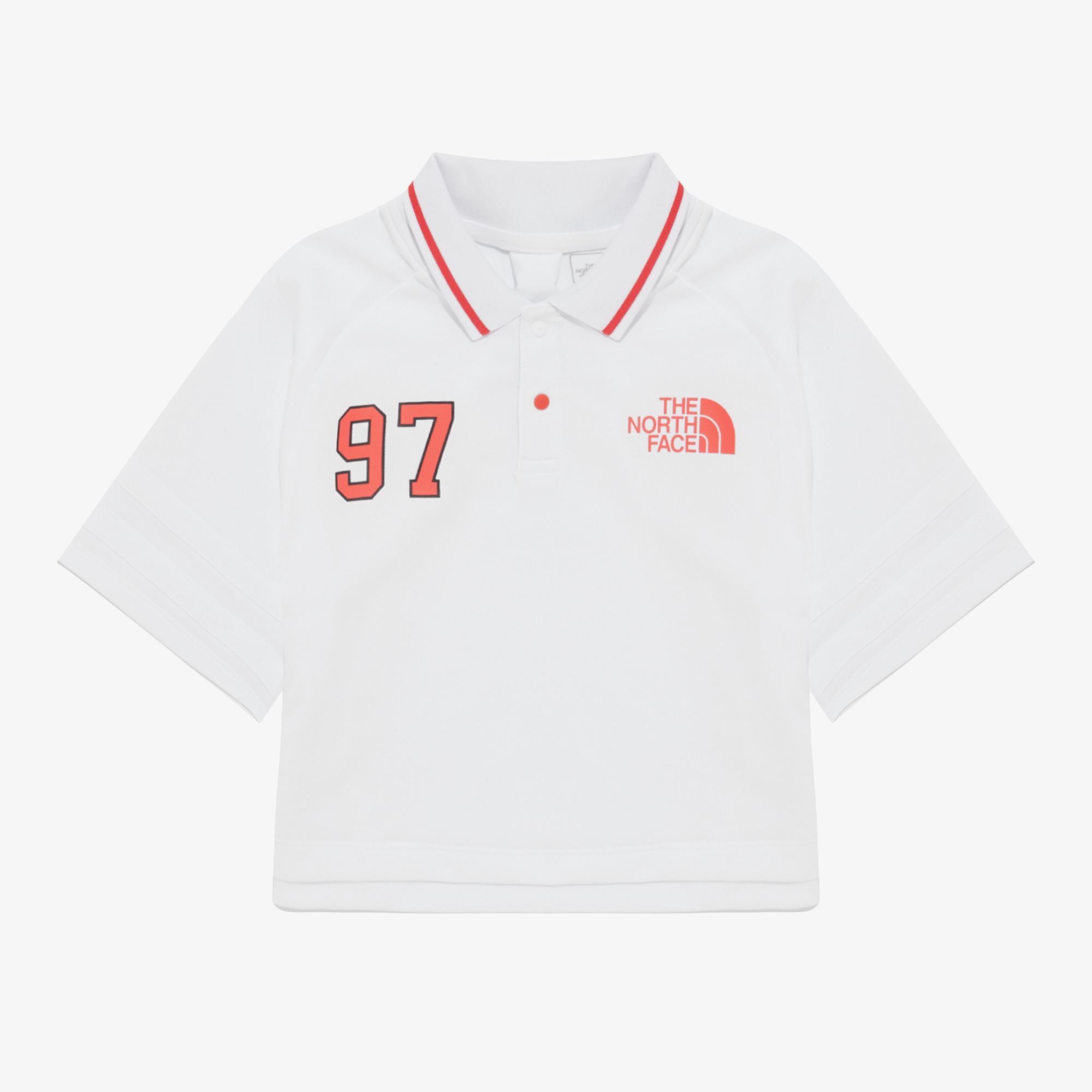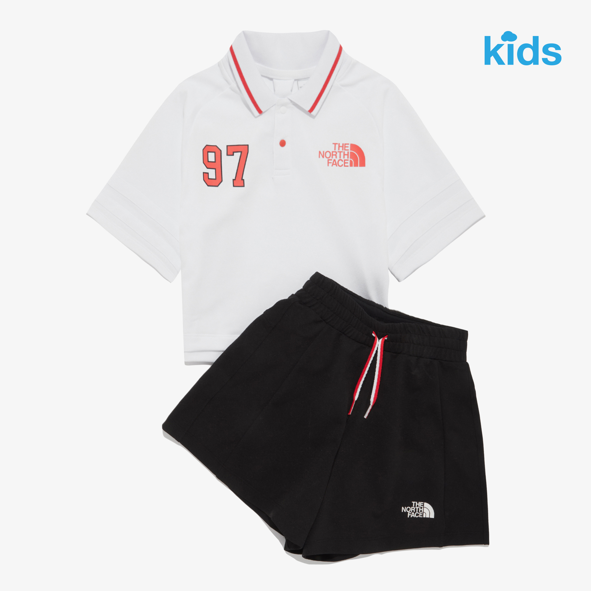 라글란 소매와 스포티한 그래픽 포인트를 준 크롭 기장의 반팔 티셔츠와 이너 팬츠가 내장된 와이드한 핏의 쇼츠로 구성된 여아용 세트입니다.