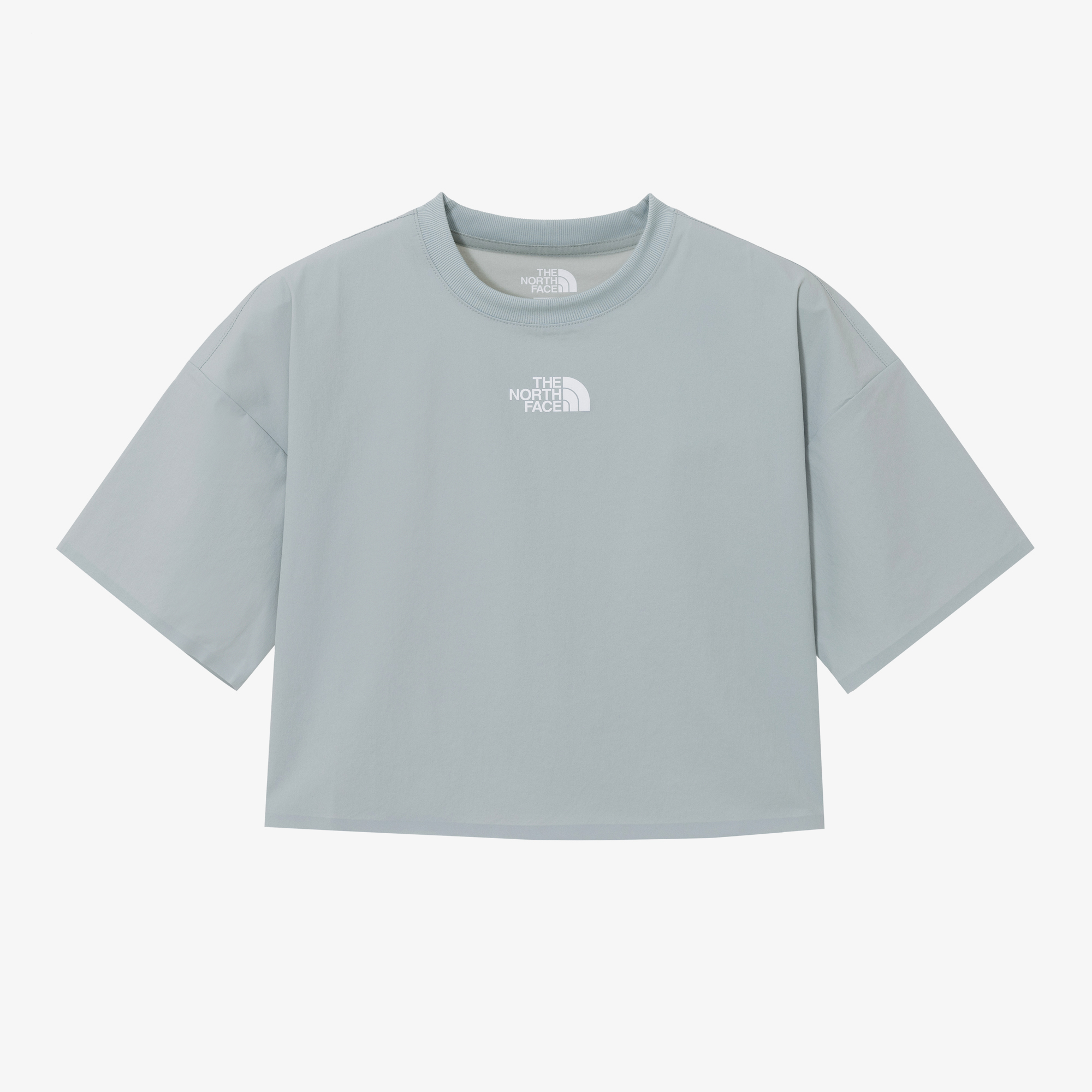 여성 전용 크롭한 기장의 우븐 라운드 반팔 티셔츠 입니다.
